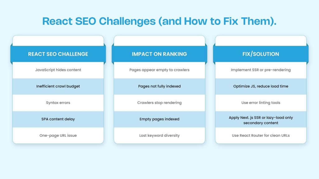 Though React presents a great option for creating user-friendly web applications, the single-page application architecture could entail notable SEO issues. SSR (server-side rendering) is often seen as superior to CSR (client-side rendering) when it comes to search engine optimization (SEO). This is mainly because server-side rendered web pages are predominantly text-based and fast loading. Search engines, or bots, crawl websites in an attempt to discover new pages to index but often have difficulty fully rewarding sites that use a lot of JavaScript, such as React.